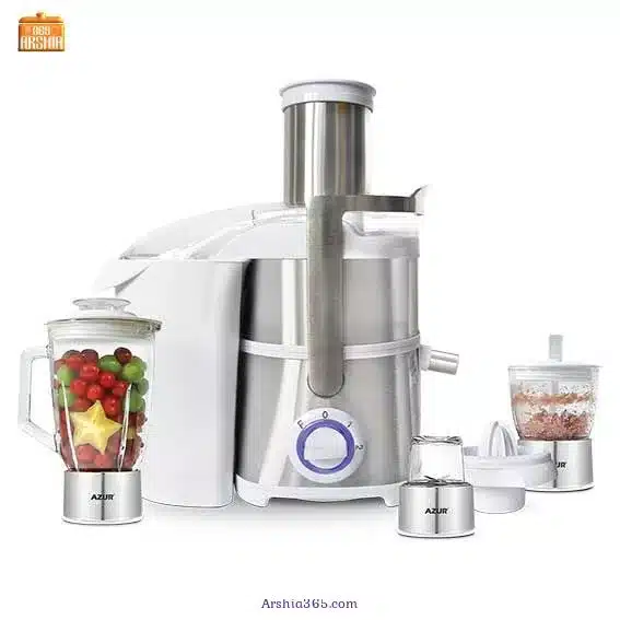 آبمیوه گیری 5 کاره آزور مدل AZ-203JB یک دستگاه چندکاره با طراحی تحت لیسانس فرانسه است که با ترکیب پنج عملکرد اصلی،آبمیوهگیری، مخلوطکن، آسیاب، خردکن و آب مرکباتگیری،تمام نیازهای شما را در تهیه نوشیدنیها و آمادهسازی مواد غذایی برطرف میکند. این مدل با توان بالا، طراحی شیک و امکانات کامل، انتخابی عالی برای خانوادههاییست که به سلامت، سرعت و راحتی در آشپزخانه اهمیت میدهند.